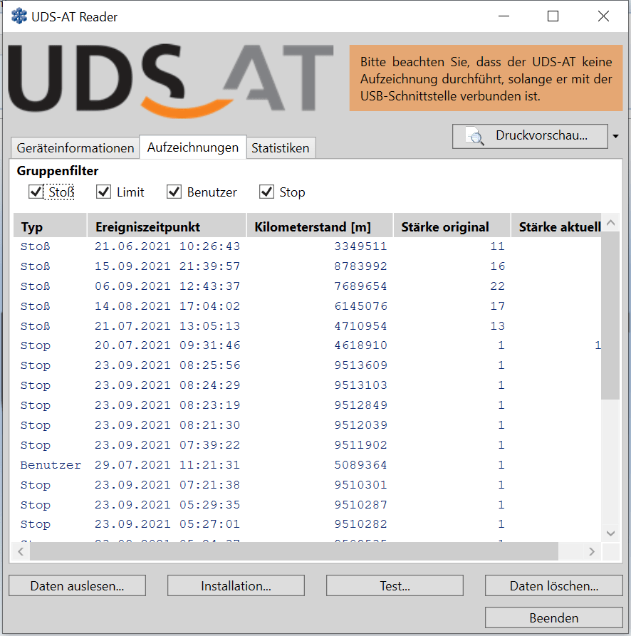 Aus dem UDS-Datensatz werden alle für die einfache Schadenaufklärung, Unfallauswertung und -bewertung relevanten Informationen ermittelt. Alle erforderlichen Daten, z.B. die Schaltzustände und Laufzeiten der aufgezeichneten Signaleingänge, Wegstrecken und Geschwindigkeiten sowie die Beschleunigungs- und Verzögerungswerte in g werden korrekturberechnet und übersichtlich ausgegeben.
