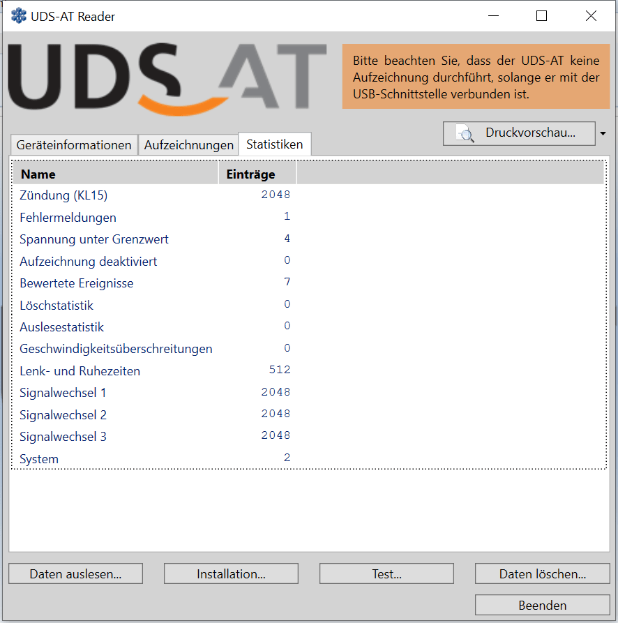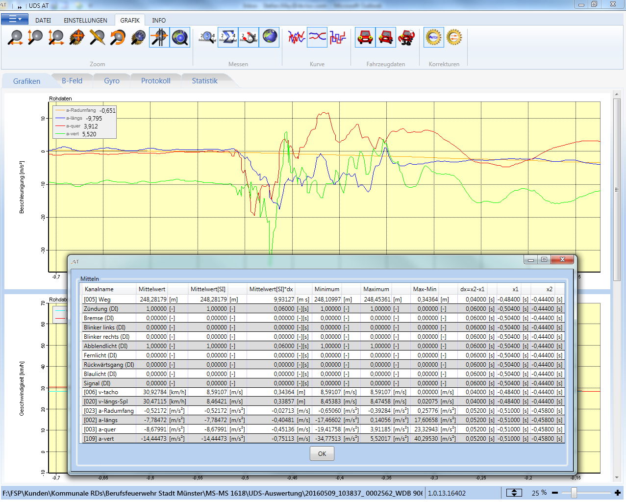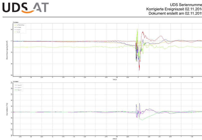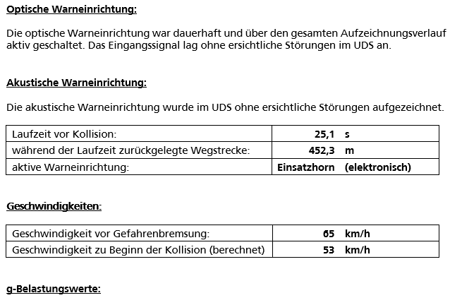 Aus dem UDS-Datensatz werden alle für die einfache Schadenaufklärung, Unfallauswertung und -bewertung relevanten Informationen ermittelt. Alle erforderlichen Daten, z.B. die Schaltzustände und Laufzeiten der aufgezeichneten Signaleingänge, Wegstrecken und Geschwindigkeiten sowie die Beschleunigungs- und Verzögerungswerte in g werden korrekturberechnet und übersichtlich ausgegeben.